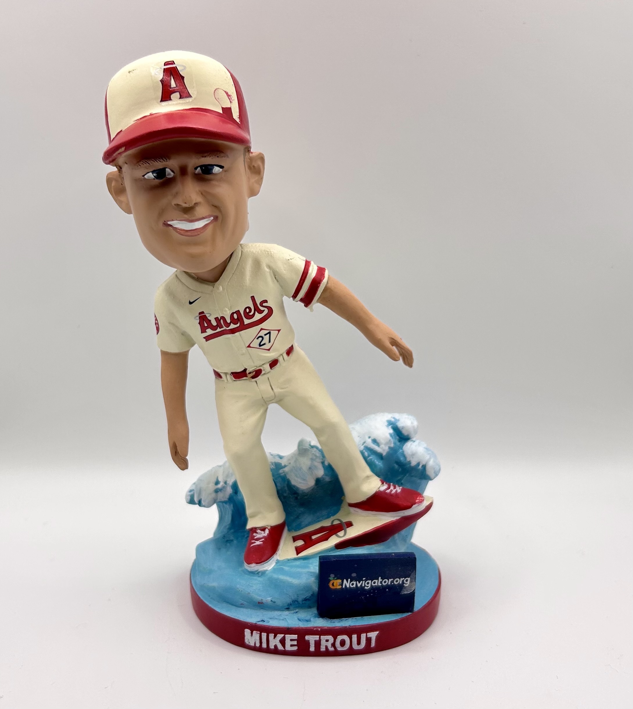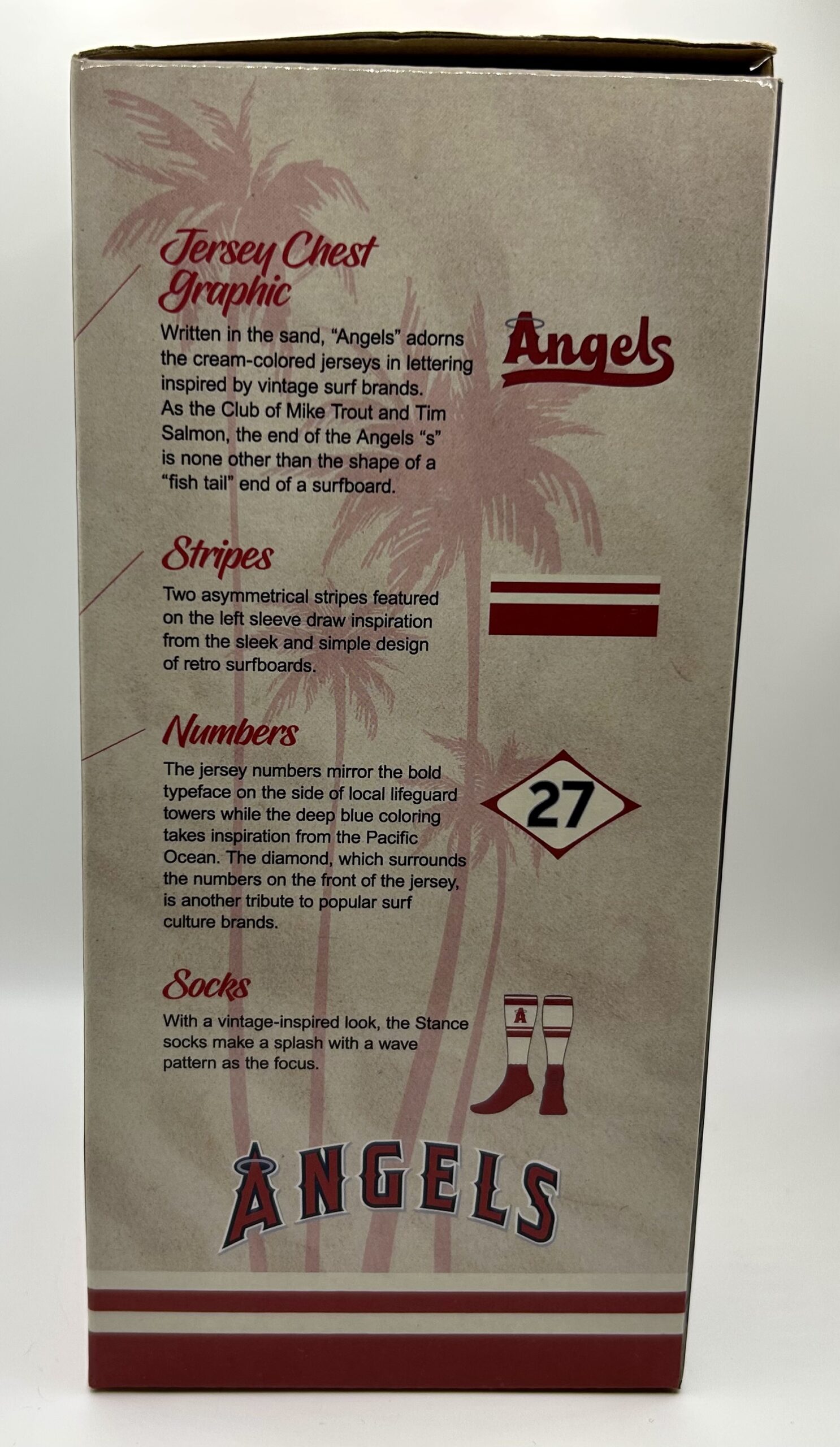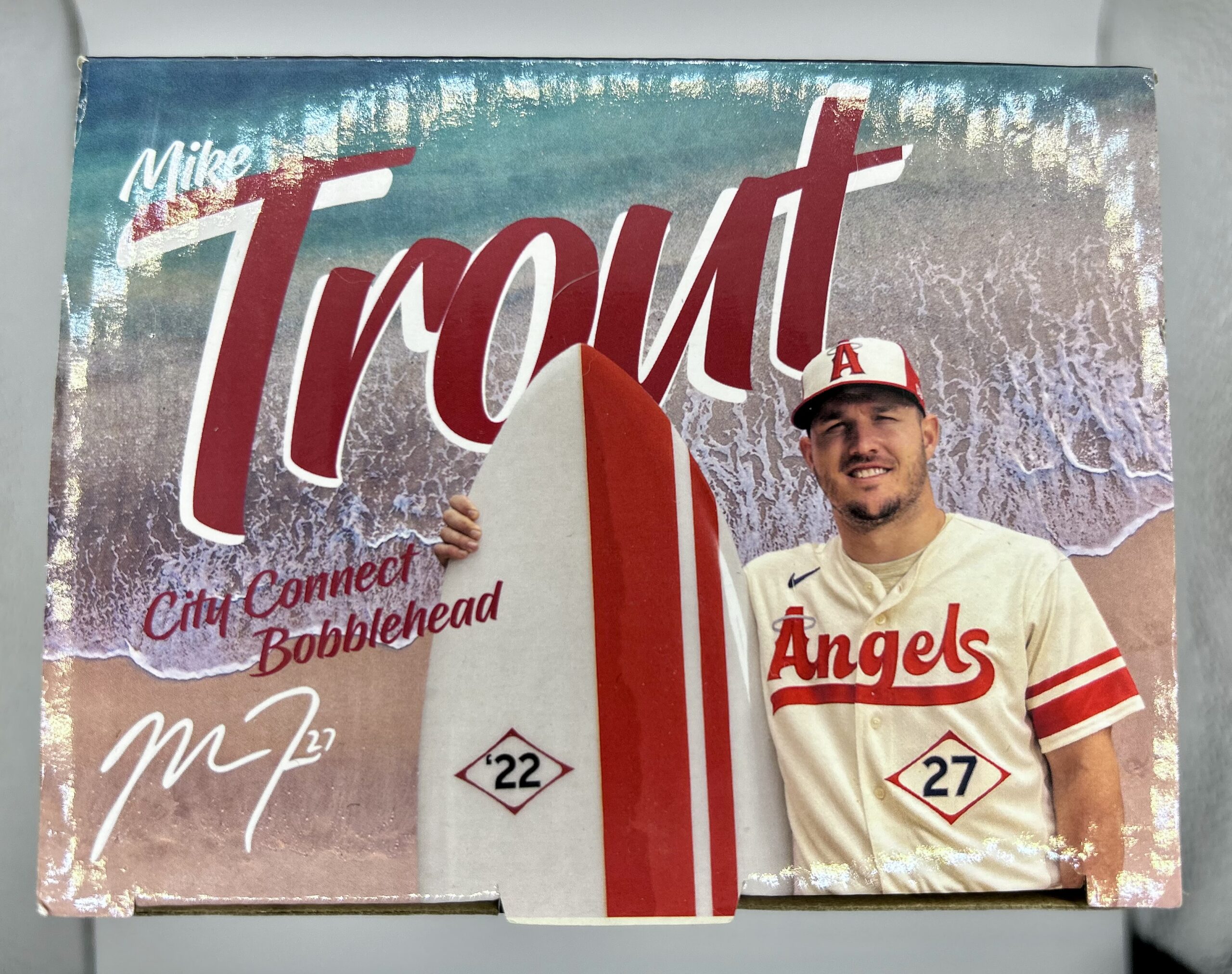 Bobble Babble: Launched in 2021, “City Connect” is a program created by Nike that introduced alternate uniforms that use different colors, typefaces, logos and sleeve patches to celebrate the culture, history, neighborhoods, or visual identity of the team’s home city rather than the club’s traditional uniform look. It also generated additional marketing and promotion opportunities, and we’re in Orange County, thus a Mike Trout surfing bobblehead.