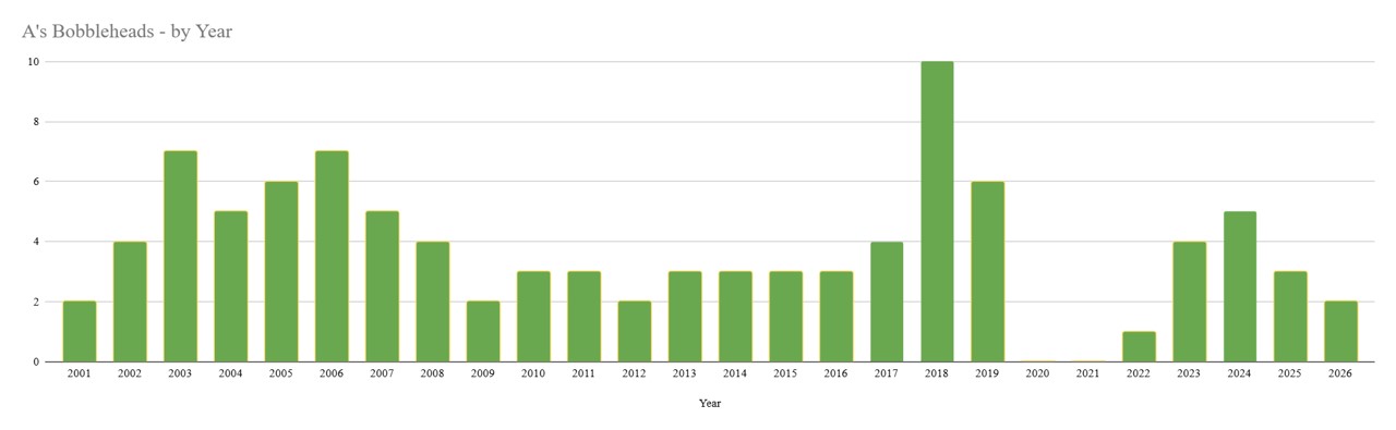 Athletics Bobble Talk: Between 2001 and 2025, the Oakland Athletics (currently playing in West Sacramento but will be eventually relocating to Las Vegas) hosted 91 bobblehead giveaway events, featuring a total of 96 unique bobbleheads. The A’s were the 13th MLB team to incorporate bobbleheads into their promotional schedule.