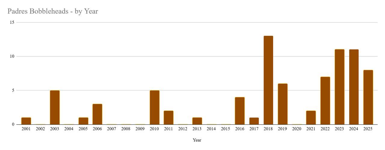 Padres Bobble Talk: Between 2001 and 2025, the San Diego Padres hosted 79 bobblehead giveaway events, featuring a total of 81 unique bobbleheads. The Padres were the 22nd MLB team to incorporate bobbleheads into their promotional schedule.